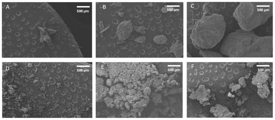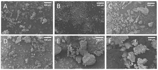 Scanning Electron Micrograph (SEM) of ultrasonic-water-treated (TWD). (A) (TR1): first residue, (B) (TR2): second residue, (C) (TR3): third residue, (D) (TS1): first supernatant, (E) (TS2): second supernatant, (F) (TS3): third supernatant.