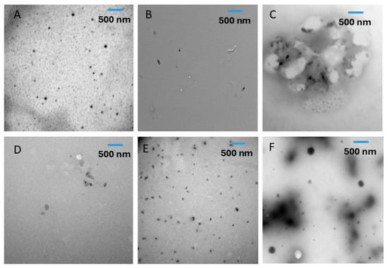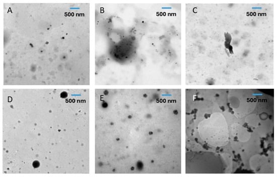 Transmission Electron Microscopy (TEM) of ultrasonic-water treatment (TWD). (A) (TR1): first residue, (B) (TR2): second residue, (C) (TR3): third residue, (D) (TS1): first supernatant, (E) (TS2): second supernatant, (F) (TS3): third supernatant.