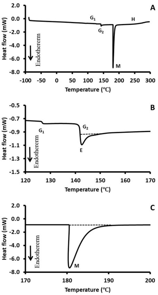 A typical heat DSC flow curve of extracted date pits with ultrasonic-water treatment (i.e., TS1). (A): Complete thermogram, (B): rescaled to clearly visualize first and second glass transitions, (C): rescaled to show solids melting.