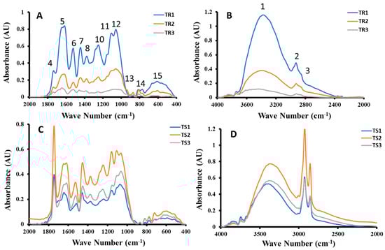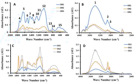 FTIR spectra of water-soaked (OR1, OR2, OR3 and OS1, OS2, and OS3) and ultrasonic-water-treated samples (OR1, OR2, OR3 and OS1, OS2, and OS3) are shown in Figure 6 and Figure 7. The degree of damage in the functional groups decreased with the increase in extraction stage (Figure 6A,B) of water-soaked fractionated residues. However, in the case of fractionated supernatants, the fraction from the first extraction stage (i.e., OS1) showed the lowest damage compared to the fractions from stages two and three (Figure 6C,D). Similar observations were seen in the ultrasonic-water-treated fractions (Figure 7). However, the degree of damage (i.e., absorption intensity) depended on the types of functional groups. In the case of Moringa leaf powder, FTIR spectroscopy showed similar functional groups; however, absorbance of typical peaks decreased with the increasing particle size. This indicated lower structural damage of the functional groups in the case of larger particles []. Similarly, Ke et al. [] also observed that there was no change in the type of functional groups in dietary fibers; however, peak strengths were enhanced. In the case of defatted millet bran with high pressure and high temperature with ultrasonic treatment, there was no appearance of new peaks, indicating that there was no modification in the functional groups; however, ultrasonic-treated rice bran showed the highest absorption intensities []. The degree of structural damage of lignocellulosic fibers indicated how fibers could interact in food and the bio-composite matrix. High molecular damage (i.e., structural splitting) in the date pits’ fractionated fibers, as evidenced by FTIR analysis, indicated their ability to form a bonding or structural network when used in foods or bio-composite []. The fractions OS1, TR1, and TS1 showed the highest molecular damage as compared to other fractions (Figure 6 and Figure 7). Therefore, these fractions could form gel-like interlinked matrices, whereas less damaged fractions could be used to make colloidal matrices in food products.