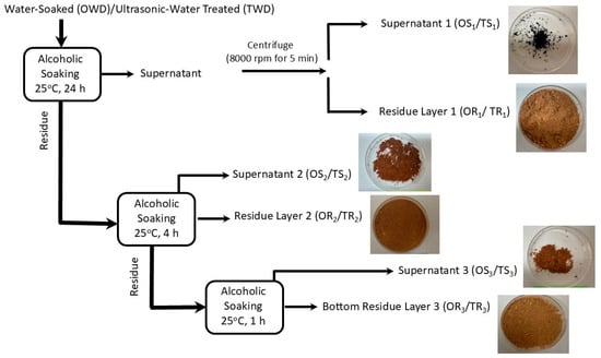 Flow diagram of the water-soaked or ultrasonic-water-treated whole date pit powder followed by alcoholic sedimentation: water-soaked (OWD), OR1: first residue, OR2: second residue, OR3: third residue, OS1: first supernatant, OS2: second supernatant, OS3: third supernatant. Ultrasonic-water-treated whole date pit powder followed by alcoholic sedimentation (TWD). TR1: first residue, TR2: second residue, TR3: third residue, TS1: first supernatant, TS2: second supernatant, TS3: third supernatant (photos included for treated date pits).