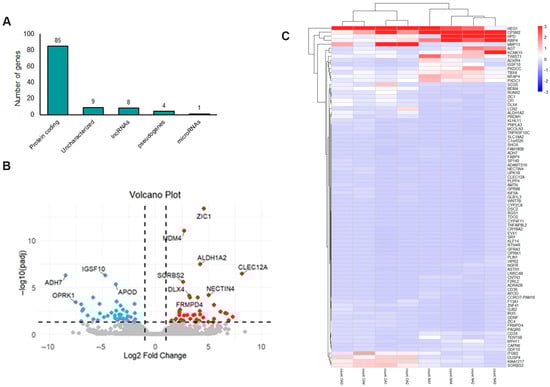 mRNA expression profile of OA meniscus: (A) Different biotypes of genes differentially expressed between OA and healthy meniscus (adjusted p-value < 0.05). (B) Volcano plot showing the differentially expressed mRNAs between OA and healthy meniscus (adjusted p-value < 0.05; absolute log2 fold change > 1). Red dots indicate significantly upregulated mRNAs and blue dots significantly downregulated mRNAs. Gray dots represent mRNAs without significant differential expression. (C) Heatmap indicating the expression patterns of OA and healthy meniscus.
