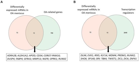 Identification of OA-related DEMs and transcription regulators. (A) Venn diagram showing the overlap between differentially expressed mRNAs observed in OA meniscus and OA-related genes obtained by Open Targets platform. (B) Venn diagram showing the overlap between differentially expressed mRNAs observed in OA meniscus and transcription regulators obtained by the AnimalTFDB database.