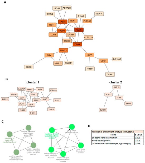 Functional interactions of proteins encoded by the 85 differentially expressed mRNAs (DEMs) in OA meniscus were investigated by protein–protein interaction (PPI) analysis. The main constructed network comprised 26 nodes with 36 edges. Among 26 nodes, 5 nodes represent genes with higher connectivity (degree (k) ≥ 5) and potential regulatory importance within the network, suggesting their central role in meniscus degradation during OA progression (Figure 3A). Among them, the CD34 molecule (CD34), RUNX2 and Fatty Acid Binding Protein 4 (FABP4) genes are known OA-related genes, as predicted by the Open Target platform.