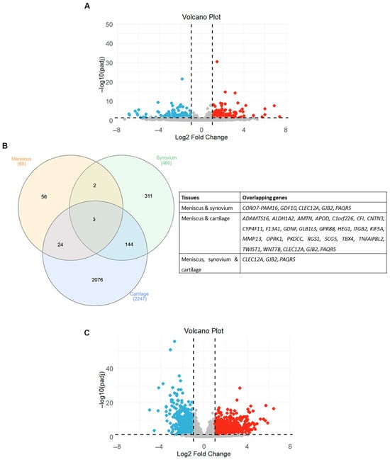 Overlapping differentially expressed genes (DEGs) in different joint components. (A) Volcano plot showing differentially expressed mRNAs between OA and healthy synovium samples. Red dots indicate significantly upregulated mRNAs and blue dots significantly downregulated mRNAs (adjusted p-value < 0.05 and |log2 fold change| > 1). Gray dots represent mRNAs without significant differential expression. (B) Venn diagram and table showing the overlapping DEGs in three OA-affected joint tissues. (C) Volcano plot showing differentially expressed mRNAs between OA and healthy cartilage samples. Red dots indicate significantly upregulated mRNAs and blue dots significantly downregulated mRNAs (adjusted p-value < 0.05 and |log2 fold change| > 1). Gray dots represent mRNAs without significant differential expression.