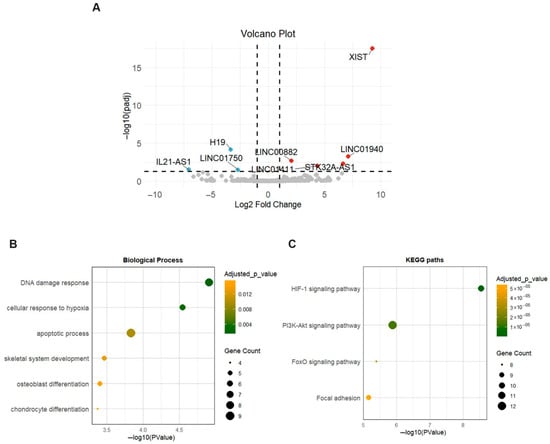 Expression profile of lncRNAs in OA meniscus. (A) Volcano plot showing differentially expressed lncRNAs between OA and healthy meniscus samples. Red dots indicate significantly upregulated lncRNAs and blue dots significantly downregulated lncRNAs (adjusted p-value < 0.05 and |log2 fold change| > 1). Gray dots represent lncRNAs without significant differential expression. (B,C) Dot plots show the enriched biological processes and KEGG pathways of target genes of differentially expressed lncRNAs. Dot size indicates the number of targets enriched in each pathway and the dot color reflects the adjusted p-value.