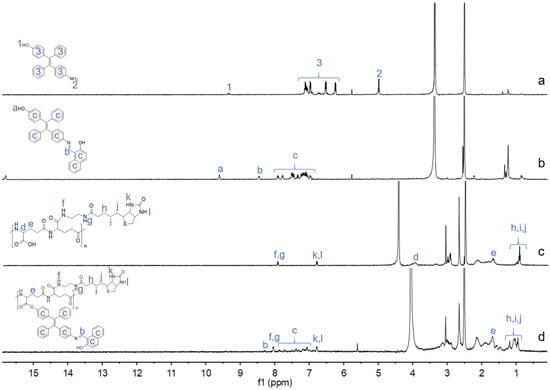 To confirm the formation of BT-PGA-TPE-HNPE, a 1H NMR analysis was conducted. As shown in Figure 1, in the spectrum of O-TPE-N, signals at 9.33 ppm (H-1) and 4.98 ppm (H-2) were attributed to the phenol hydroxyl protons and the amino protons, respectively. For O-TPE-HNPE, the signal assigned to the amino protons at 4.98 ppm (H-2) disappeared. New signals observed at 9.59 ppm (H-a) and 8.45 ppm (H-b) were ascribed to the phenol hydroxyl protons on tetraphenylene and the imine protons, respectively, which demonstrated the successful synthesis of O-TPE-HNPE. In the spectrum of BT-PGA, signals located at 1.69–1.91 ppm (H-e) and 4.02 ppm (H-d) belonged to the methylene protons and methane protons of γ-PGA, respectively. Signals attributed to the protons in the structure of biotin were presented at 6.82 ppm (H-k, l) and 0.93–1.00 ppm (H-h, i, j). New signals at 7.95–7.93 ppm (H-f, g) were assigned to the amide protons, which were generated via the reaction of ethylenediamine with the carboxyl groups of γ-PGA and biotin. For BT-PGA-TPE-HNPE, the signal assigned to the imine protons of O-TPE-HNPE was still observed at 8.03 ppm (H-b), while the signal ascribed to the phenolic hydroxyl protons of O-TPE-HNPE (H-a) disappeared completely. Moreover, the signal attributed to the amide protons was shifted to 8.05–8.03 ppm (H-f, g). All these pieces of evidence demonstrated the successful formation of BT-PGA-TPE-HNPE. From the integration unit ratio, the substitution degree of biotin and O-TPE-HNPE for γ-PGA was about 15.3% and 6.2%, respectively.