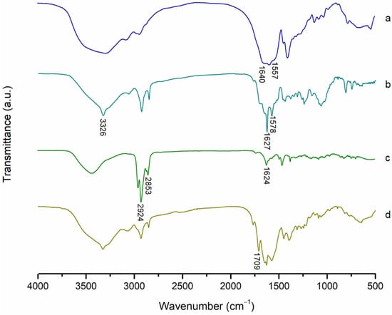 FTIR spectra of (a) γ-PGA, (b) BT-PGA, (c) O-TPE-HNPE and (d) BT-PGA-TPE-HNPE.
