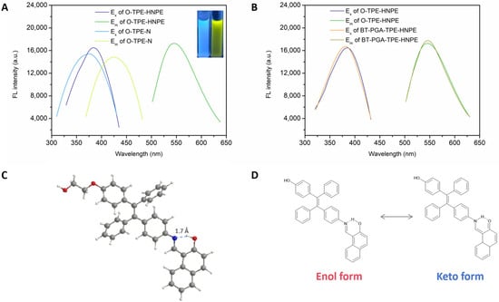 (A) Fluorescence excitation (Ex) and emission (Em) spectra of O-TPE-N (Ex = 375 nm, Em = 425 nm) and O-TPE-HNPE (Ex = 384 nm, Em = 546 nm) in water. Inset: Images of O-TPE-N and O-TPE-HNPE solutions taken under a 365 nm UV lamp. (B) Fluorescence excitation and emission spectra of BT-PGA-TPE-HNPE (Ex = 381 nm, Em = 546 nm) in water. (C) 3D molecular structure diagram of O-TPE-HNPE. (Red represents oxygen atoms, blue represents nitrogen atoms, gray represents carbon atoms, and white represents hydrogen atoms.) (D) Transformation of ketone and enol forms of O-TPE-HNPE.