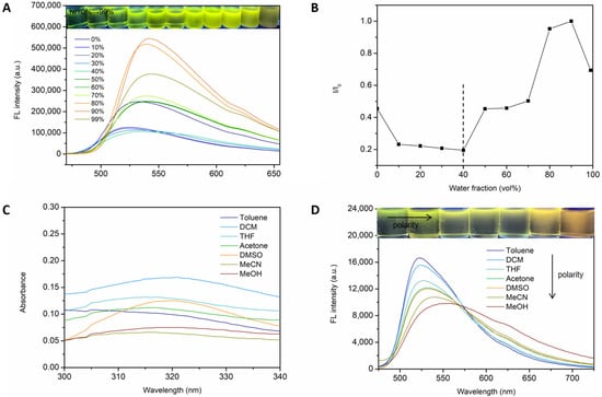 To investigate the AIE characteristics of O-TPE-HNPE, the emission spectra in a series of THF/water mixtures were determined using THF as the good solvent and water as the bad solvent. As shown in Figure 4A, with the increase in fw, the fluorescence intensity was gradually enhanced. This could be due to the decrease in the solubility of O-TPE-HNPE, which led to the aggregation of the molecules. As a result, the intramolecular motions were restricted, and the emission was significantly enhanced. However, when fw reached 99%, the fluorescence intensity decreased slightly, which could be explained by the precipitation of the polymer. To conduct a more in-depth investigation, the change in fluorescence intensity with fw was determined. As presented in Figure 4B, when fw increased from 0% to 40%, the emission band was redshifted and the fluorescence intensity decreased, which could be due to the change in the polarity of the solvent [].