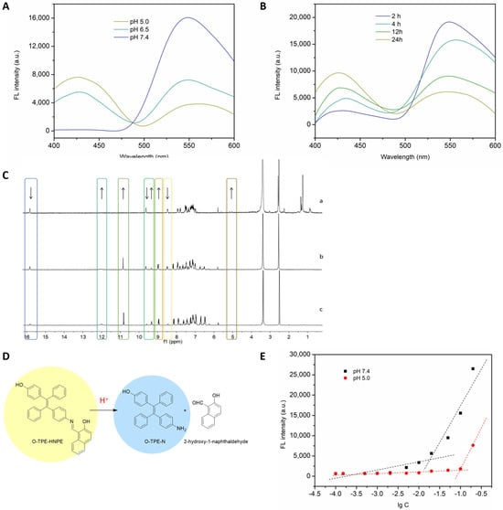 (A) Fluorescence spectra of O-TPE-HNPE at different pH values. (B) Fluorescence spectra of O-TPE-HNPE after incubation in PBS 6.5 for different durations. (C) 1H NMR spectra of O-TPE-HNPE after incubation for 4 h at: (a) pH 7.4, (b) pH 6.5, and (c) pH 5.0. (The direction of the arrow indicates the change in the intensity of the characteristic peak.) (D) Mechanism of pH-sensitive fluorescent color change. (E) Fluorescence intensity as a function of logarithm of copolymer concentration in different pH conditions.