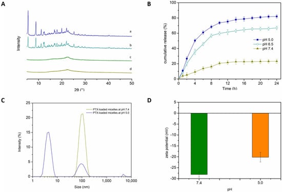 (A) XRD patterns of (a) PTX, (b) the physical mixture of PTX and blank micelles, (c) blank BT-PGA-TPE-HNPE micelles, and (d) PTX-loaded BT-PGA-TPE-HNPE micelles. (B) Drug release profiles of PTX-loaded BT-PGA-TPE-HNPE micelles in PBS with different pH. (C) Particle size distribution profiles of micelles after incubation with PBS 7.4 and PBS 5.0. (D) Zeta potential distribution of micelles after incubation with PBS 7.4 and PBS 5.0.