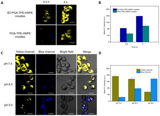 The fluorescence color behavior of BT-PGA-TPE-HNPE micelles under different pH conditions was also detected after incubation for 4 h. As shown in Figure 7C, bright yellow fluorescence was observed in the cytoplasm at a pH of 7.4. At a pH of 6.5, both yellow and blue fluorescence were detected in the cytoplasm. While at a pH of 5.0, much brighter blue fluorescence and weaker yellow fluorescence were observed. The mean fluorescence intensity value of each image is presented in Figure 7D. These results demonstrated that with the decrease in pH, the intensity of the yellow fluorescence decreased, while the blue fluorescence intensity increased, which renders the BT-PGA-TPE-HNPE micelles an excellent pH-sensitive color changeable property for the real-time monitor of drug release.
