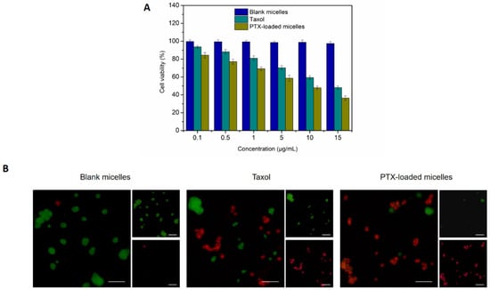In addition, live/dead cell staining was also carried out to further investigate the killing effect of PTX-loaded BT-PGA-TPE-HNPE micelles on cancer cells. The green fluorescent Calcein AM could stain live cells, while the red fluorescent PI dye could only enter and stain dead cells. As shown in Figure 8B, strong green fluorescence was observed in the blank micelles group. For the PTX formulation groups, a larger red fluorescence area was seen in the PTX-loaded micelles group than the Taxol group, indicating the enhanced killing effect of the drug-loaded micelles. It could be deduced that the PTX-loaded BT-PGA-TPE-HNPE micelles exhibited superior toxicity on tumor cells [].