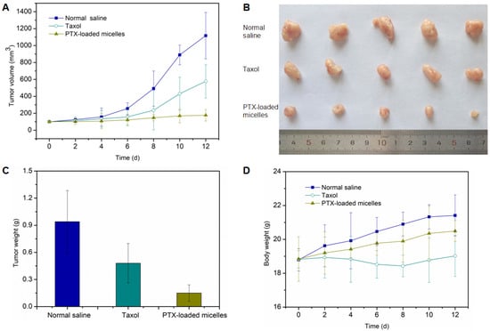 The antitumor activity of the PTX-loaded BT-PGA-TPE-HNPE micelles was further evaluated via a tumor growth inhibition study in 4T1 tumor-bearing mice. As shown in Figure 9A, tumors grew rapidly in the saline-treated group, while the Taxol and the PTX-loaded BT-PGA-TPE-HNPE micelles exhibited an evident inhibitory effect on tumor growth. The same trend could also be noted from Figure 9B,C, i.e., the tumors of the mice in the treated groups were much smaller than those in the normal saline group. Furthermore, the micelles-treated group exhibited the smallest tumor sizes, indicating their superior tumor inhibition effect. The design of the BT-PGA-TPE-HNPE micelles played an important role for the superior antitumor efficacy of PTX. Specifically, the BT-PGA-TPE-HNPE micelles could accumulate in tumors through the EPR effect due to their nano-size of about 100 nm. The introduction of the active targeting ligand biotin facilitated the effective entry of micelles into tumor cells. Meanwhile, the negative charge prevented the micelles from being cleared by the mononuclear phagocyte system and increased their circulation time in the blood so as to improve their chances of uptake via the EPR effect. In tumor tissues, the acidic environment triggered the breakage of imine bonds in the micelles, thus promoting the drug release.