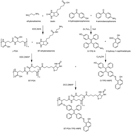 The synthesis process of BT-PGA-TPE-HNPE was briefly summarized in Scheme 1. On the one hand, O-TPE-HNPE was prepared using a two-step reaction. Firstly, 4-aminobenzophenone reacted with 4-hydroxybenzophenone via the McMurray reaction to produce O-TPE-N. Then, a Schiff base reaction was performed between O-TPE-N and 2-hydroxy-1-naphthaldehyde, and O-TPE-HNPE was obtained with a pH-sensitive imine bond in the structure. On the other hand, using ethylenediamine as the connecting arm, biotin was conjugated with γ-PGA through amide reactions, leading to the formation of BT-PGA. At last, the carboxyl groups of BT-PGA were linked with the hydroxyl groups of O-TPE-HNPE via the formation of ester bonds, and BT-PGA-TPE-HNPE was obtained.