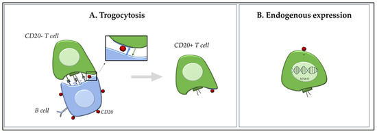 However, critics of these models point out that CD20 expression on T cells can be stable for prolonged periods, both in vitro and in vivo, whereas trogocytosed proteins are typically expressed only transiently. Moreover, CD20+ T cells have been identified in the absence of B cells in specific immunodeficient models and following anti-CD20 mAb therapy (e.g., rituximab—RTX), where CD20+ T cells persist despite an extensive depletion of B cells [12].