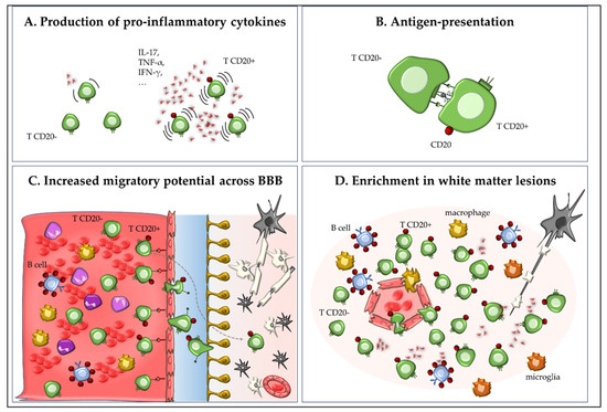 Multiple sclerosis (MS) is a chronic inflammatory demyelinating and degenerative disease of the central nervous system (CNS) that has long been considered as mediated by T lymphocytes [1]. However, over the past decades, this paradigm has been challenged by the remarkable effectiveness of therapeutic monoclonal antibodies (mAbs) depleting B cells through the engagement of the surface marker CD20 [2,3]. In addition to the antibody production, pathogenetic roles of B cells likely include promotion of T cell activation by acting as antigen-presenting cells (APCs) and production of pro-inflammatory cytokines, which contribute to tissue damage and demyelination in both white matter (WM) and deep/cortical grey matter (GM). Interestingly, although historically considered a specific B cell marker, CD20 is also expressed by a small percentage of T lymphocytes, although at low levels (CD20dim or CD20+ T cells) [4,5]. CD20+ T cells show an activated proinflammatory phenotype and have been increasingly implicated in the pathogenesis of autoimmune diseases, particularly MS and its animal model, experimental autoimmune encephalomyelitis (EAE). CD20+ T cells are effectively targeted by anti-CD20 mAbs, raising the intriguing hypothesis that their depletion may contribute to the therapeutic efficacy of such molecules [6,7,8].
