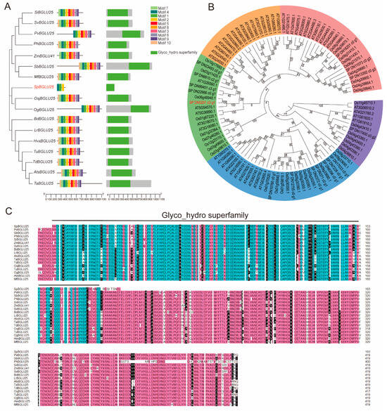 A BLAST comparison of the SpBGLU25 protein was conducted using the NCBI database, resulting in the selection of the top 32 homologous genes with the highest sequence similarity for further analysis. The findings revealed that these genes are predominantly found in 17 species of monocots, with one sequence from each species exhibiting the greatest homology to the BGLU gene. Phylogenetic and sequence alignment analyses were performed using MEGA and DNAman, respectively, demonstrating that these genes share certain similarities. Domain analysis indicated that all BGLUs possess a common conserved domain from the Glyco_hydro superfamily (Figure 1A,C). While SpBGLU contains three conserved motifs, all other genes have more than five motifs, underscoring the high conservation of BGLU (Figure 1A).