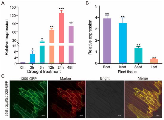 Expression analysis of the SpBGLU25 gene (A): Expression levels of the SpBGLU25 gene under different drought stress durations. (B): Expression of the SpBGLU25 gene in different tissues of S. pennata. (C): Subcellular localization of the SpBGLU25 protein in onion. (Green is the 1300-GFP fluorescent protein, red is the cell membrane marker, and yellow is due to the overlap of green and red fluorescence, indicating the result of colocalization). Note: *, **, and *** denoting significant differences at p < 0.05, 0.01, and 0.001 levels, respectively.