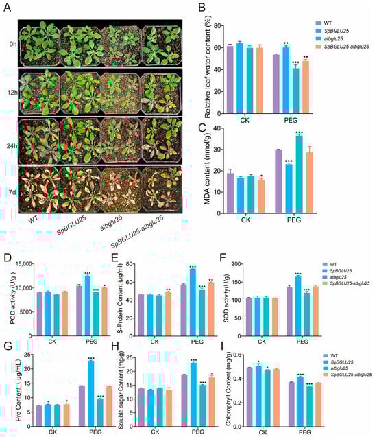 To further assess the drought tolerance of the SpBGLU25 transgenic Arabidopsis, this study evaluated various physiological indicators in the four types of plants: wild type (WT), SpBGLU25 overexpression, atbglu25 knockout, and SpBGLU25-atbglu25 complementation. Measurements were taken under normal growth conditions and 24 h after the 20% PEG, focusing on indicators such as relative water content (RLWC), malondialdehyde (MDA), peroxidase (POD), superoxide dismutase (SOD), proline (Pro), soluble sugars, soluble proteins, and chlorophyll.