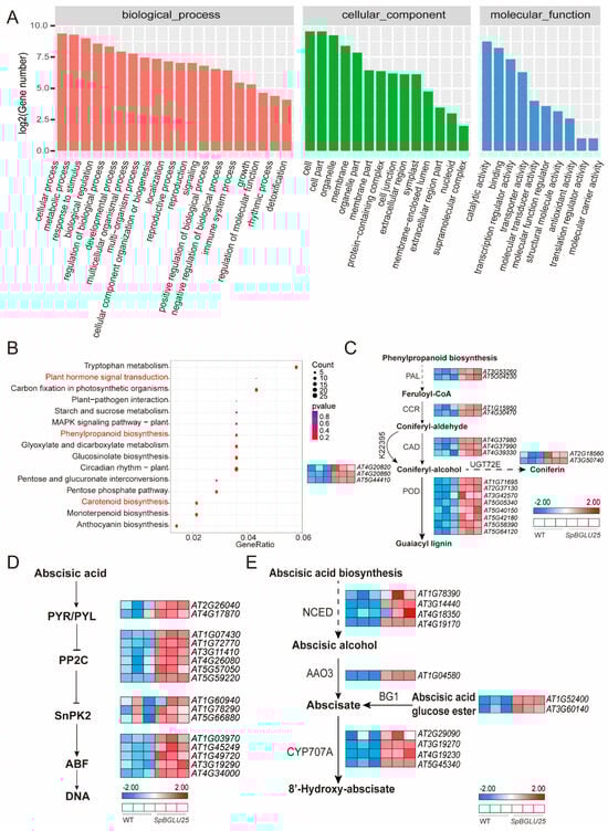 Transcriptomic analysis of differentially upregulated genes in SpBGLU25-overexpressing vs. wild-type (WT) Arabidopsis. (A): GO analysis of upregulated differentially expressed genes (UDEGs) in SpBGLU25 vs. WT Arabidopsis. (B): KEGG enrichment analysis of UDEGs in SpBGLU25 vs. WT Arabidopsis. (C): Expression levels of key phenylpropanoid biosynthesis pathway genes in SpBGLU25 vs. WT. (D): Expression levels of ABA signaling pathway genes in SpBGLU25 vs. WT. (E): Expression levels of ABA biosynthesis pathway genes in SpBGLU25 vs. WT.