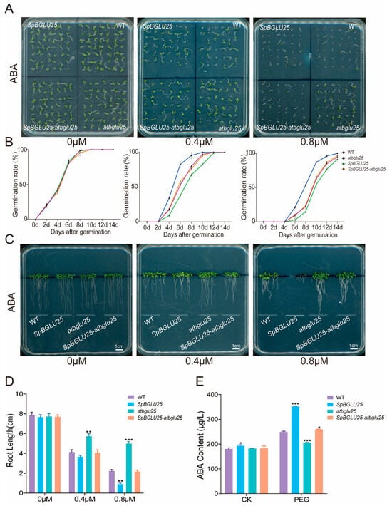 Effects of ABA treatment on seed germination and root development in SpBGLU25, WT, atbglu25, and SpBGLU25-atbglu25 Arabidopsis. (A): Phenotypic images of germination rates of four Arabidopsis types under different concentrations of ABA treatment. (B): Statistical chart of germination rates of four Arabidopsis types under different concentrations of ABA treatment. (C): Phenotypic images of root lengths of four Arabidopsis types under different concentrations of ABA treatment. (D): Statistical chart of root lengths of four Arabidopsis types under different concentrations of ABA treatment. (E): Detection of ABA content in four Arabidopsis types under PEG treatment. Note: *, **, and *** denoting significant differences at p < 0.05, 0.01, and 0.001 levels, respectively.