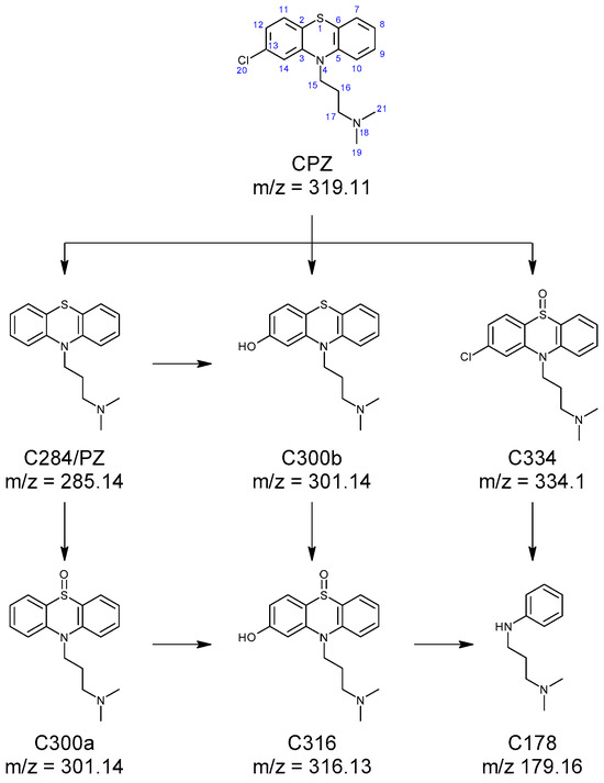 Formation of C178, C284 (promazine), C300a (promazine sulfoxide), C300b (2-hydroxypromazine), C316 (2-hydroxypromazine sulfoxide), and C334 (chlorpromazine sulfoxide) photoproducts of CPZ.