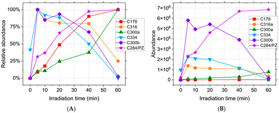 The recorded precursor ions for C600abc (m/z 601.22) are consistent with CPZ–promazine dimers. In the case of C600a, this proposed structure is supported by the formation of the m/z 318.12 and m/z 284.13 radical cations upon fragmentation of the [M + 2H]2+ ion. For C600bc, fragmentation of the same ion simultaneously forms m/z 516.14 and m/z 86.1, while the m/z 516.14 to m/z 443.05 is consistent with the loss of C4H11N from the second N,N-dimethylpropanamine moiety, thus showing that the bond between the CPZ and promazine is formed with the participation of the two phenothiazine moieties. Figure 2 and Figure 3 show the abundance of the CPZ photoproducts over the course of laser irradiation (5, 10, 20, 40, 60 min). The relative (Figure 2A) and absolute (Figure 2B) abundance clearly illustrate the time variation in each photoproduct. The reason for this type of representation is that each compound has a different ionisation efficiency depending on its structure [47]. Because of that, the abundance cannot be directly correlated with the concentration in solution. As such, compounds with low ionisation efficiencies would have a low abundance regardless of concentration, thus falsely implying a low concentration in solution. Thus, the abundances of different compounds cannot be directly compared without knowing the ionisation efficiency. In order to bypass this restriction, the relative abundance can be calculated as the measured abundance normalised by the maximum recorded abundance for each compound.