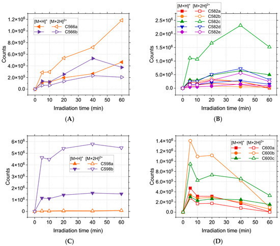 Abundance of high m/z photoproducts of CPZ irradiation over the course of 60 min: (A) C566ab; (B) C582abcde; (C) C598ab; (D) C600abc.
