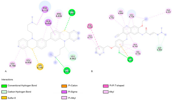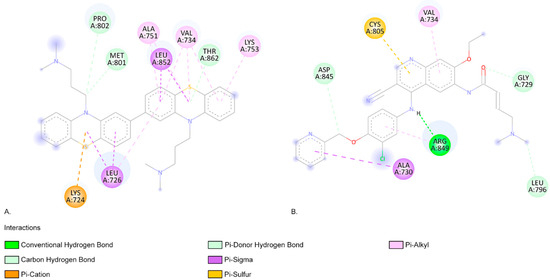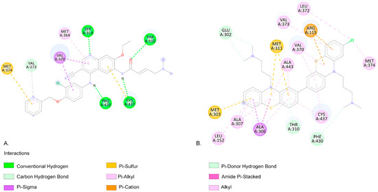 As shown in Figure 6, neratinib forms a hydrogen bond with the aa residue LYS745 of EGFR. The C566a photoproduct forms two conventional hydrogen bonds with the aa residues LYS875 and TYR891. LYS745 is a highly conserved aa residue across all kinases, and its role in phosphotransfer during catalysis is crucial [63]. Additionally, the C566a photoproduct forms a pi–sigma interaction with PHE723 from the p-loop residue of EGFR (Figure 6). Stover et al. reported that aa residues TYR891 and TYR920 are highly phosphorylated in the breast tumour cell line MCF7 [64].