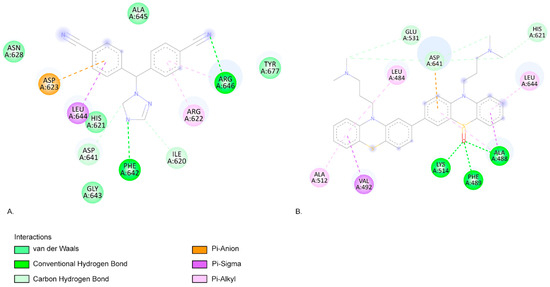 (A). The two-dimensional representation of the letrozole structure and the aa residues from its binding site when interacting with the FGFR1. (B). The two-dimensional structure of C582e and the aa residues from its binding site. Both letrozole and C582e compounds present favourable interactions with the aa residues ASP641, HIS621, and LEU644.
