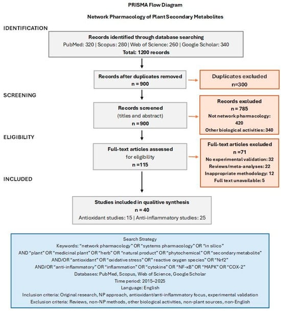 The inclusion criteria were as follows: (1) original research papers published in peer-reviewed journals in English; (2) studies applying NP approaches (including target prediction, network construction, and pathway analysis) to investigate antioxidant and/or anti-inflammatory mechanisms of plant secondary metabolites, extracts, or formulations; and (3) studies integrating in silico findings with experimental validation (in vitro or in vivo) or molecular docking comparisons.