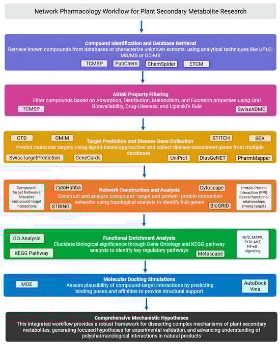 Network pharmacology (NP) has emerged as a particularly powerful computational approach for investigating the complex bioactivities of natural products. Unlike traditional single-target paradigms, NP embraces the polypharmacological nature of plant extracts by analyzing interactions within biological networks. The analytical pipeline typically involves the following steps: (1) identification of compounds from natural sources; (2) target prediction using computational tools; (3) compilation of disease-associated genes; (4) network construction, integrating compounds, targets, and disease-related proteins; (5) topological analysis to identify key nodes; (6) pathway enrichment analysis; and (7) in silico validation through molecular docking [,,,].