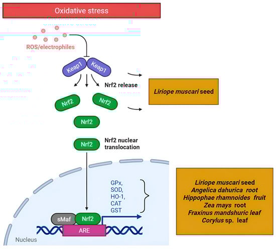 MAPK pathways (ERK, JNK, p38) were implicated in the antioxidant mechanisms of components from Liriope muscari seed extract [], Litsea coreana bud and leaf extract [], Chimonanthus praecox flower extract [], Citrus sinensis leaf extract [], Dracaena angustifolia leaf extract [], Zea mays root extract [], Corylus sp. leaf extract [], and Fraxinus mandshuric leaf extract []. These pathways are known responders to oxidative stress that regulate antioxidant gene expression [].