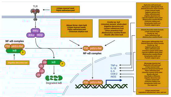 A schematic representation of the NF-κB pathway targeted by plant secondary metabolites (Created in Biorender. Anna Merecz-Sadowska. (2025) https://BioRender.com (accessed on 15 May 2025)).
