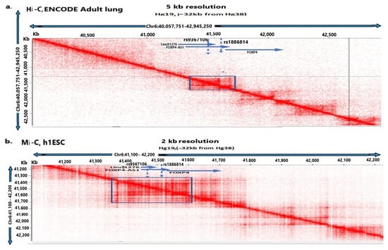 Physical interaction of rs9367106 carrying FOXP4-AS1 and LINC01276 with FOXP4. Chromosome 6 (x-axis, distance) is plotted against chromosome 6 (y-axis, distance) to visualize the interaction within the same chromosome. The interacting regions spanning LINC01276 and FOXP4 region are shown in (a) Adult lung cells (ENCODE) at 5 kb resolution by Hi-C (High-C, the lowest available resolution) and (b) in situ Mi-C (Micro-C, in h1ESC (human 1 Embryonic Cells) at 2 kb resolution. The square box in “Blue” shows interacting projections from the diagonal line pointing to the positions of both SNPs, FOXP4-AS1 and FOXP4 promoter. Both Hi-C and Mi-C show that the SNP (rs9367106) region with LINC01276 and FOXP4-AS1 physically interacts with the FOXP4 promoter and coding regions in two different experiments.