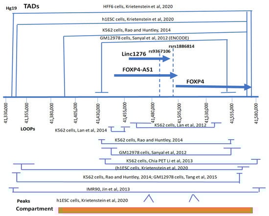 The interacting domains (TADs, Topologically Associated Domains, loops of interactions, and compartment analysis were also performed in Juicebox. The interacting regions of rs9367106, FOXP4-AS1, and FOXP4 genes are presented in Hg19, which is −32 kb different from Hg38 in this region. Compartment analysis was performed in the MI-C dataset of h1ESC cells by software Eigenvector (accessed on 10 January 2025) (https://github.com/aidenlab/Juicebox/) [] at 500 kb resolution (the maximum resolution available in this software).