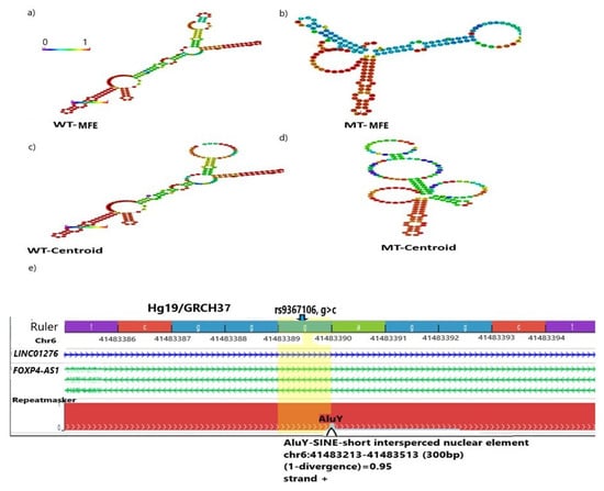Structural modeling of rs9367106 carrying the flanking sequence. Both pairwise base and centroid modeling show altered RNA structure in WT (G) and mutant RNA (C). MFE (Minimum Free Energy) indicates the stability of the RNA structure. (a) WT MFE secondary structure model (MFE, −72.90 kcal/mol), and (b) MT MFE (MFE, −52.50 kcal/mol), (c) WT centroid model (MFE, −69.00 kcal/mol), and (d) MT centroid model (MFE, −39.70 kcal/mol). MFEs in WT in both models are lower, indicating a more stable RNA structure than MT. Base pairing ability determines the stable folded structure. The color bar denotes the probability of being unpaired from lowest (blue, 0) to highest (red, 1). Increased unpaired residues (blue) in MT in both cases increased the instability. (e) Epigenetic analysis shows that rs0367106 (blue arrow) includes a SINE/ALU-Y sequence. Notably, the G>C transition disrupts the ALU-Y sequences, and disruption of the ALU-Y sequence prevents activation of innate immunity.