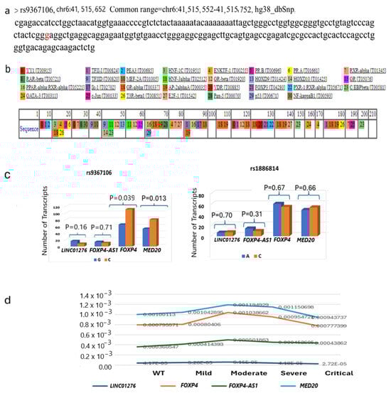 rs9367601 binds with TFs and changes the expression of target genes. (a) The 100 bp flanking sequences of both sides of the SNP are shown with rs9367106 G marked in red. (b) The transcription factor binds between 90 bp and 100 bp (G>C transition is in 99 bp) designated by the numbers within the box along the length are 1, 16, 17, 18, 19, and those are represented by the list as YY1, PPAR-α, IK-1, GR-α, and AP2αA, respectively. (c) The effect of G (WT) and risk allele (C) of rs9367106 on the expression of LINC01276, FOXP4-AS1, FOXP4 and MED20 for both SNPs. C represents those patients who have at least one C allele. (d) The normalized expression of LINC01276, FOXP4-AS1, FOXP4, and MED20 in healthy individuals and COVID-19 patients who developed PCC phenotypes after recovery from mild, moderate, severe, and critical infection. FOXP4 and MED20 expression are markedly increased synchronously in moderate and severe patients but not in critical patients.