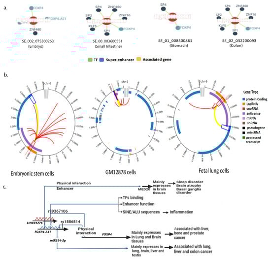 The rs9367106 carrying flanking sequences act as an enhancer. (a) The target of rs9367106 carrying superenhancers that act on FOXP4 and associated genes in various tissues. Notably, although the superenhancer including rs9367106 interacts with FOXP4 in all tissues, but with different genes in different tissues. (b) Visual representation of superenhancer targets correlated with physically interacting genes. The superenhancer that originates within LINC01276