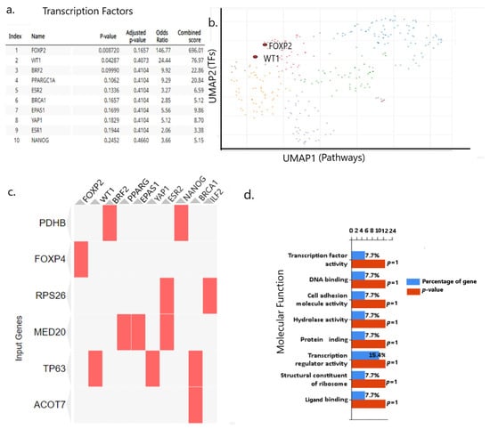 rs9367106-mediated modulation of TFs leading to molecular function. (a) Ranking of TFs mostly affected by rs9367106 with p-value and score of activation. (b) Scatter plot of these TFs (UMAP2) showing the highest activities they mediate through FOXP2 and WT1 (TP63) (both are highlighted in red) pathway (UMAP1). (c) heatmap shows (matched red box) the FOXP4 acts on the FOXP2-FOXP1 pathway, and MED20 mediates through PPARG and EPHA activation. (d) Molecular function of co-expressed TFs. The rs9367106 co-expressed genes in the Geneset are involved in various molecular functions, ranging from TFs activation to cell adhesion and DNA/protein binding activities.