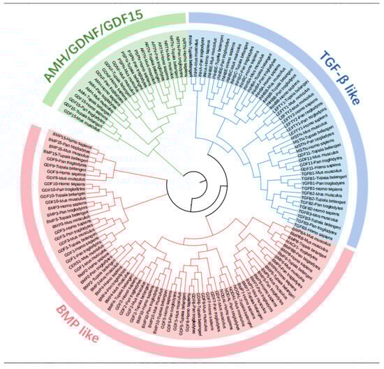 The transforming growth factor beta (TGF-β) gene was first identified in 1978 as a factor with cell transformation activity, isolated from the culture medium of mouse sarcoma virus cell lines []. Subsequently, numerous factors exhibiting transformation activity were discovered, leading to the gradual development of a vast gene family []. The TGF-β gene family comprises a class of multifunctional cytokines that are widely present across the animal kingdom, playing a central role in various cellular processes, including cell proliferation, differentiation, apoptosis, inflammatory responses, and autophagy []. The diversity and complexity of TGF-β family members enable them to play critical roles in regulating body temperature and metabolic pathways in organisms. With advancements in DNA sequencing technology, members of the TGF-β family in species such as Homo sapiens, Mus musculus, and Pan troglodytes have been identified; however, research on the TGF-β gene family in T. belangeri remains unexplored [,,].