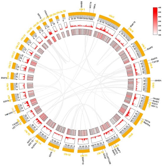 We extracted the location information of the TGF-β gene family members from the GFF3 file of the genome of T. belangeri and created chromosome location maps. These genes were distributed across 16 chromosomes and four overlapping groups (Figure 2). Notably, chromosome 6 contains the highest number of TGF-β gene family members, with four identified in T. belangeri. Additionally, three members of the TGF-β gene family were located on chromosomes 1, 9, and 14, while two members each were found on chromosomes 4, 7, 10, 16, and 27. One member of the TGF-β gene family was located on chromosomes 3, 5, 11, 13, 18, 20, X, and the four overlapping groups. There was a tandem repeat sequence of the genes INHBE and INHBC located on chromosome 6. BMP3 exhibited similar positions and color gradients (expression levels) across multiple chromosomes, suggesting its conservation and potential critical role in bone development (Figure 3). The expression patterns of the genes INHBA, BMP4, BMP5, GDF9, GDF11, TGFB2, and NODAL were also similar across multiple chromosomes, indicating that their functions may be conserved in these regions. In the inter-species collinearity plot, numerous lines connect H. sapiens and M. musculus with T. belangeri, highlighting a close genetic relationship and high genetic similarity among them (Figure 4). Conversely, there were few lines connecting P. troglodytes and T. belangeri, suggesting a significant degree of genomic rearrangement between these species.