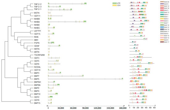 Using MEME (https://meme-suite.org/meme/ [accessed on 14 March 2024]), the conserved motifs of the TGF-β gene family members in T. belangeri were predicted, setting the number of motifs to 20 while keeping the remaining parameters at their default values. Additionally, TBtools was utilized to create a schematic diagram illustrating the gene structure and conserved sequences of the TGF-β gene family members in T. belangeri [].