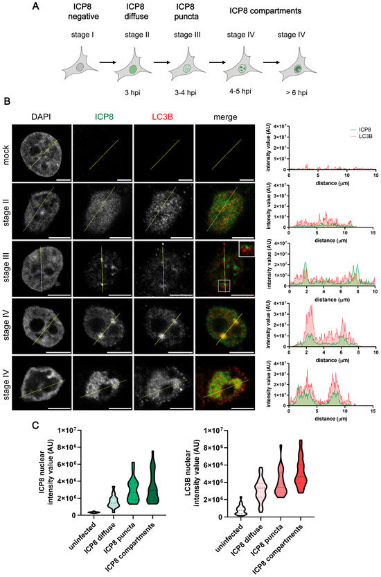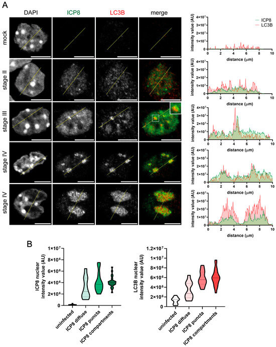 Replication compartments (RCs) of HSV-1 are formed in the nuclear regions devoid of chromatin. RCs are membraneless inclusions within the nucleus that constitute spherical domains where viral gene transcription, DNA replication, and viral genome packaging take place [38,39,40]. Since LC3B has been described as an RNA-binding protein [41], we decided to monitor those viral structures. Using immunofluorescence microscopy, we monitored the formation of RCs by analyzing the nuclear distribution of the major DNA-binding protein ICP8 (Figure 2A) [33] ICP8 staining becomes detectable in stage II of RC formation. In this stage, ICP8 microfoci are formed and this protein can be observed in a diffuse pattern in the nucleus. Cells in stage III display foci of ICP8, which correspond to pre-replicative sites. The coalescence of these small pre-replicative sites leads to the formation of larger punctate foci and, finally, to the generation of large globular structures corresponding to mature RCs (stage IV) (Figure 2A) [42].