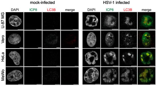 To assess whether the nuclear detection of LC3B in infected HOG cells and OPCs is specific to OLs, we analyzed LC3B staining during infection in other cell types. For this purpose, we used the U-87 MG cell line, derived from a human astrocytoma; the Vero cell line, from kidney tissue of an African green monkey; the HeLa cell line, from a human adenocarcinoma; and the MeWo cell line, from a human melanoma. Immunofluorescence images showed LC3B staining in the HSV-1 RCs at stage IV, as in our glial cell models, when using a polyclonal anti-LC3b antibody. As seen in HOG cells and OPCs, no LC3B signal was detected in the nucleus of non-infected cells (Figure 4).