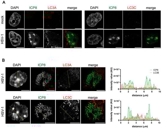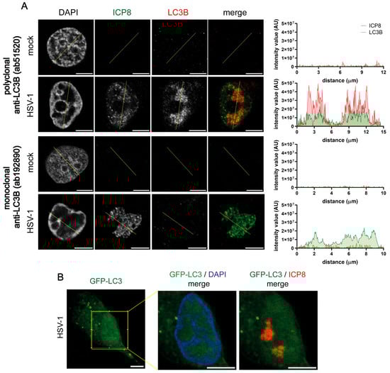 Some authors reported that different LC3 antibodies led to distinct levels of LC3 nuclear staining, with nuclear LC3 being more easily seen with polyclonal antibodies compared with monoclonal ones [44]. A rabbit polyclonal LC3B (2220SS) antibody was used in the previous experiments. We have repeated these assays in HOG cells using another rabbit polyclonal LC3B antibody (ab51520) and a monoclonal one (ab192890). Nuclear LC3B staining was detected in HSV-1-infected cells with the polyclonal antibody ab192890, whereas no signal was observed using the monoclonal antibody (Figure 5A). These results indicate that the nuclear signal in infected cells was not exclusively detected with the polyclonal LC3B 2220SS antibody. In fact, it was also generated with other polyclonal antibodies against LC3B. This suggests that the generation of the nuclear LC3B signal in infected cells is characteristic of polyclonal antibodies.