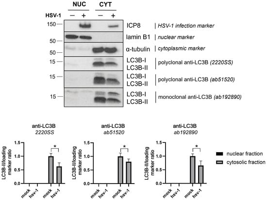 LC3B was not detected in the nuclear fraction of HSV-1 infected cells by immunoblot analysis. HOG cells were infected with HSV-1 (m.o.i. = 40) for 6 hpi. The protein expression levels of LC3B in nuclear and cytosolic fractions of the infected HOG cells were measured by immunoblotting using the polyclonal LC3B antibodies 2220SS and ab51520 and the monoclonal LC3B antibody ab192890. The antibody against ICP8 was used to detect HSV-1 infection. Representative Western blots are shown for LC3B-I/II. The ratios of LC3B-II/lamin B1 and LC3B-II/α-tubulin were calculated for the nuclear and cytosolic fractions, respectively. The data were further normalized to the value of mock-infected cells (set to 1) and reported as the mean ± standard error (SEMs) (n = 4). No LC3B protein was detected in the nuclear fraction of HSV-1-infected and mock-infected HOG cells. The LC3B protein was found to be present in the cytoplasm of infected and uninfected cells. The LC3B-II/I ratio was significantly lower during infection, indicating an inhibition of autophagic flux. Significance was evaluated using a two-tailed Mann–Whitney test, which compared each column with its respective mock control. *, p < 0.05.