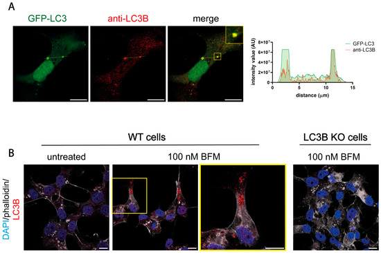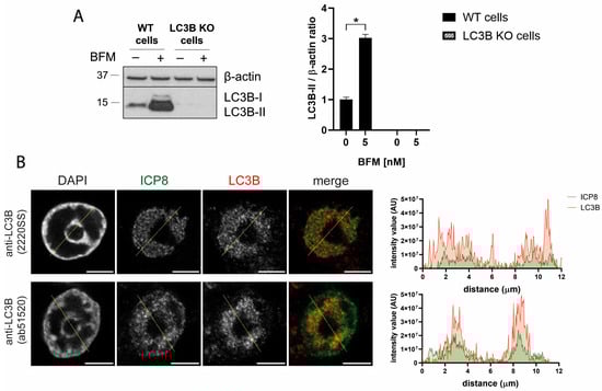 To verify the specificity of the polyclonal LC3B antibodies, we generated LC3B KO HOG cells using the CRISPR/Cas9 system. The absence of LC3B was confirmed by immunoblotting. LC3B was not detected in LC3B KO cells, even after treatment with the inhibitor of lysosomal acidification, bafilomycin A1 (BFM) (Figure 8A). Since LC3B KO cells are deficient in autophagy, a crucial process for homeostasis maintenance and cellular survival, we examined the morphology and the cell viability of these cells. The cell viability of KO cells remained above 90%, and no significant changes were observed in the cellular morphology (Figure S4).